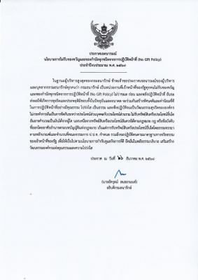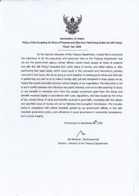 ประกาศเจตนารมณ์ นโยบายการไม่รับของขวัญและของกำนัลทุกชนิดจากการปฏิบัติหน้าที่ ประจำปีงบประมาณ พ.ศ. 2569 "No Gift Policy)"
